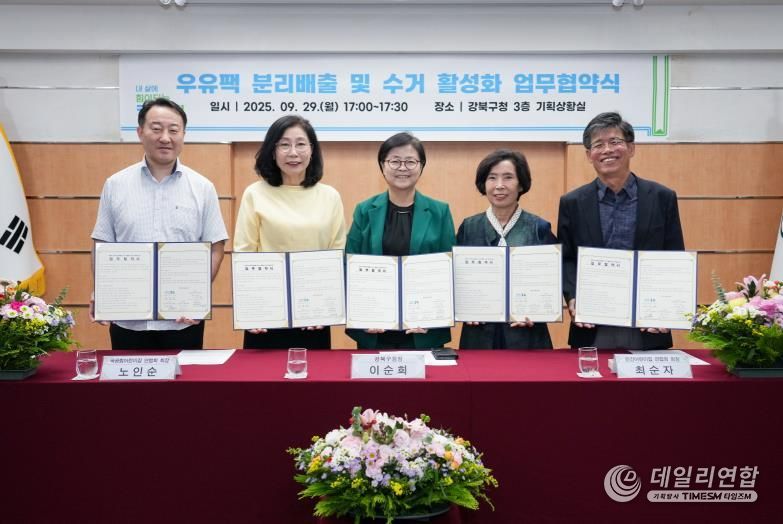 데일리연합 (SNSJTV) 김민제 기자 | 서울 강북구는 9월 29일(월) 구청 기획상황실에서 강북구어린이집연합회와 어진이마을관리 사회적협동조합과 함께 우유팩 분리배출 및 수거 활성화 기반 구축을 위한 업무협약을 체결했다고 밝혔다.