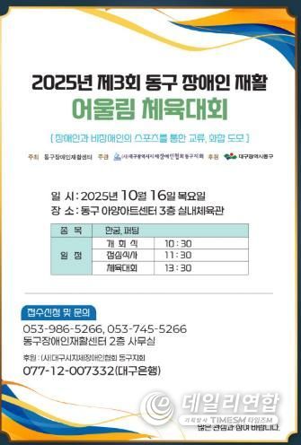 데일리연합 (SNSJTV) 김준 기자 | 대구 동구청은 오는 16일, 아양아트센터에서 동구장애인 재활센터 주최로 ‘제3회 동구 장애인 재활 어울림 체육대회’를 개최한다.