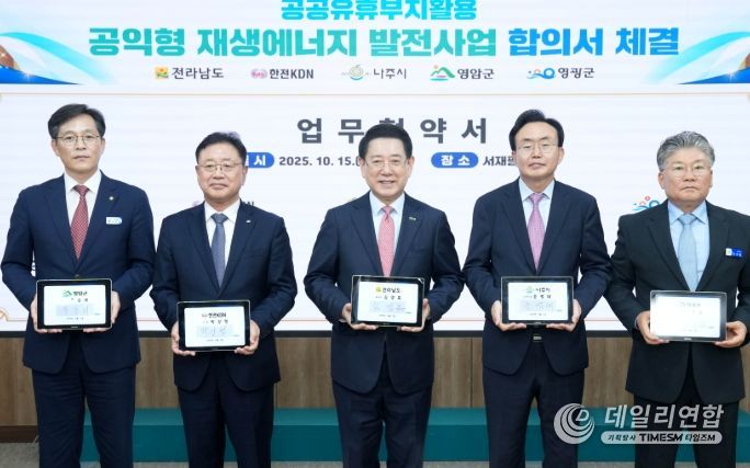 데일리연합 (SNSJTV) 임재현 기자 | 전라남도는 15일 새정부의 재생에너지 대전환 기조와 재생에너지 보급 확대 정책에 따라 나주시, 영광군, 영암군, 한전KDN과 탄소중립 실현·에너지 기본소득 실현을 위한 ‘공익형 재생에너지 발전사업’ 업무협약을 했다고 밝혔다.