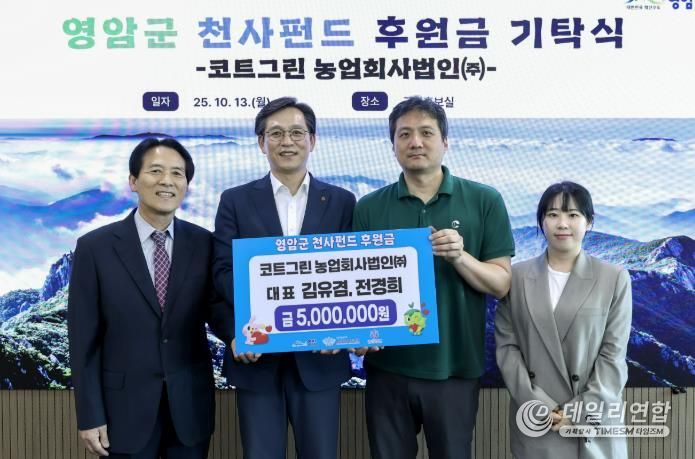 데일리연합 (SNSJTV) 김민제 기자 | 코트그린농업회사법인(주)가 13일 영암군청에 천사펀드 500만원, 고향사랑기부금 200만원을 각각 전달했다.
