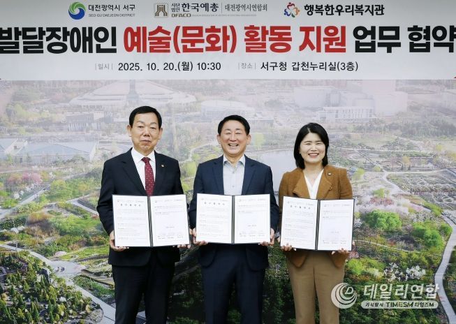 데일리연합 (SNSJTV) 김준 기자 | 대전 서구는 발달장애인 문화예술 활동 지원을 위해 (사)한국예총 대전광역시연합회 및 행복한우리복지관과 3개 기관 업무협약을 체결했다고 20일 전헀다.