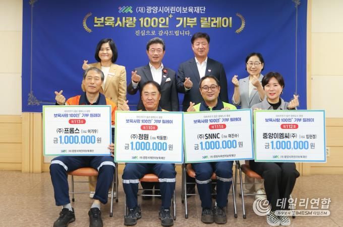 데일리연합 (SNSJTV) 김준 기자 | (재)광양시어린이보육재단이 지난 10월 20일 광양시청 만남실에서 ‘보육사랑 100인+ 기부 릴레이’ 후원금 기탁식을 개최했다.
