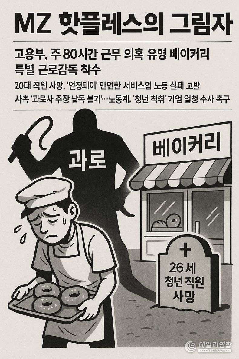 데일리연합 (SNSJTV) 김민제 기자 | 소위 'MZ 핫플레이스'로 불리며 폭발적인 인기를 끌어온 유명 베이커리 프랜차이즈에서 20대 직원이 장시간 노동 끝에 사망했다는 의혹이 불거지면서, 고용노동부가 해당 업체에 대한 특별 근로감독에 전격 착수했다. 이번 사태는 겉으로는 화려하지만 내부는 취약한 국내 서비스 산업의 노동 환경, 특히 청년층에게 집중되는 과도한 '열정페이' 실태를 적나라하게 드러내며 사회적 공분을 키우고 있다.