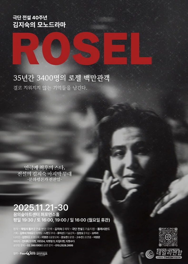 데일리연합 (SNSJTV) 김민제 기자 | 극단 전설 40주년 기념작이자 배우 김지숙의 마지막 공연인 모노드라마 〈로젤〉이 오는 11월 21일부터 30일까지 꿈의숲아트센터 퍼포먼스홀에서 막을 올린다. 35년간 3,400회 이상 공연되며 백만 명이 넘는 관객을 울린 이 작품은 여성의 주체성과 인간성의 회복을 그린 한국 연극사의 대표작으로 꼽힌다.