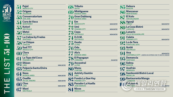 LATIN AMERICA'S 50 BEST RESTAURANTS, 2025년 51-100위까지 확장 명단 공개