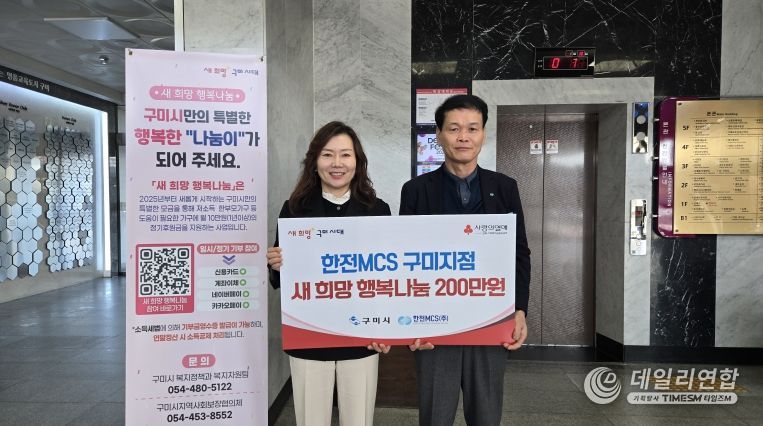 데일리연합 (SNSJTV) 김민제 기자 | 구미시는 지난 18일 한전MCS 구미지점(지점장 정경우)으로부터 '새 희망 행복나눔' 성금 200만원을 기탁받았다.