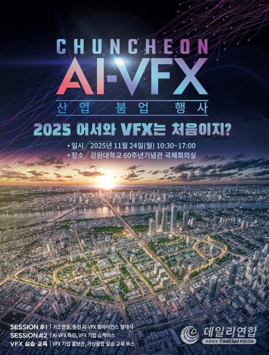 데일리연합 (SNSJTV) 김민제 기자 | 춘천시는 2025년 11월 24일 강원대학교 60주년 기념관 국제 회의실에서 ‘춘천 AI-VFX 산업붐업행사 – 2025 어서와! VFX는 처음이지?’를 개최한다고 밝혔다.