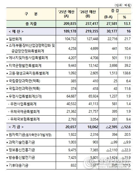 데일리연합 (SNSJTV) 임재현 기자 | 과학기술정보통신부는 정부안 대비 746억원 증액된 총 23조 7,417억원 규모의 과기정통부 2026년도 정부 예산 및 기금운용계획이 12월 2일 국회 본회의 의결을 통해 최종 확정됐다고 밝혔다.