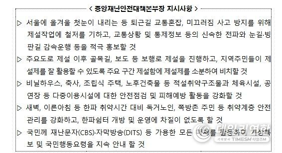 아울러, 국민께서도 기상정보를 수시로 확인하고, 주간 시간대 안전한 상황에서 제설작업을 실시하는 등 국민행동요령을 준수해 주실 것을 당부했다.