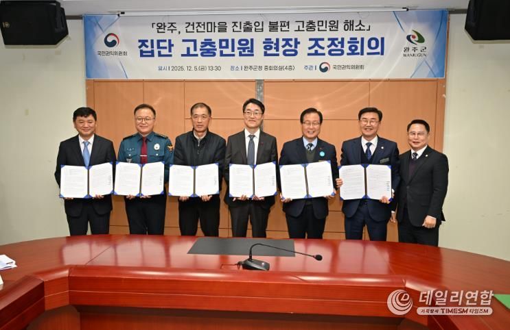 데일리연합 (SNSJTV) 장우혁 기자 | 완주군의회 유의식 의장과 성중기 예산결산특별위원장은 5일 국민권익위원회, 완주군, 완주경찰서, 전주국토관리사무소, 건전마을 주민 대표와 함께 운곡교 인근 교통 불편 해소를 위한 조정안에 최종 합의하고 공식 협약을 체결했다.
