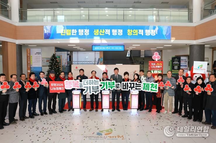 데일리연합 (SNSJTV) 장우혁 기자 | 제천시의회는 8일 제천시청 로비에서 열린 ‘희망2026나눔캠페인 사랑의 온도탑’ 제막식에 참석해 성금 584,000원을 기부했다.