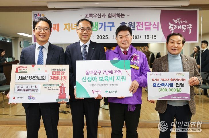 데일리연합 (SNSJTV) 김준 기자 | 서울 동대문구가 관내 ‘일곱째 아이’ 출생 가정을 찾아 축하와 응원의 마음을 전했다. 동대문구는 16일 회기동 주민센터에서 다자녀 가정을 격려하는 행사를 열고, 민간 후원과 연계한 지원 물품과 후원금을 전달했다고 밝혔다.