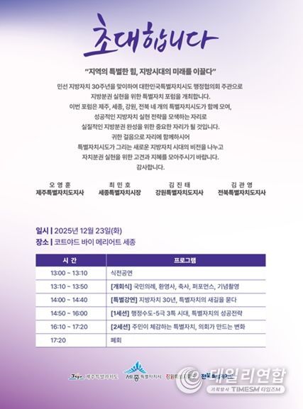 데일리연합 (SNSJTV) 김민제 기자 | 강원특별자치도는 12월 23일 코트야드 바이 메리어트 세종에서 강원, 제주, 세종, 전북 4개 특별자치시도지사들이 모여 대한민국특별자치시도 행정협의회 두 번째 정기회의를 개최했다.