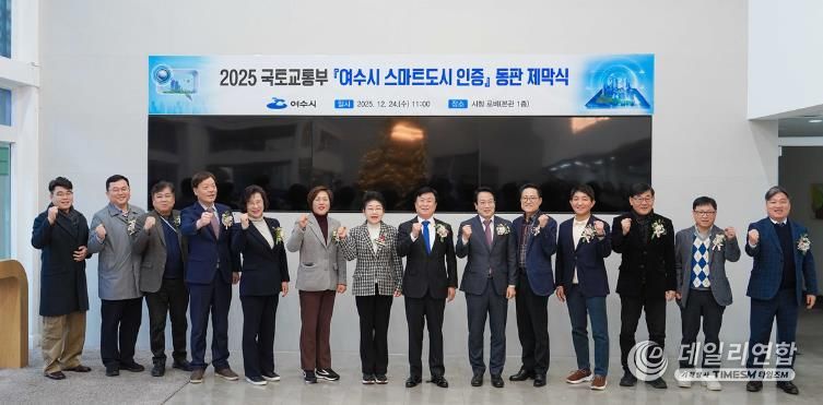 데일리연합 (SNSJTV) 김민제 기자 | 여수시는 호남권 최초로 국토교통부 주관 ‘2025년 스마트도시 인증’에 선정되면서 지난 24일 시청 본관 1층 로비에서 동판 제막식을 개최했다.