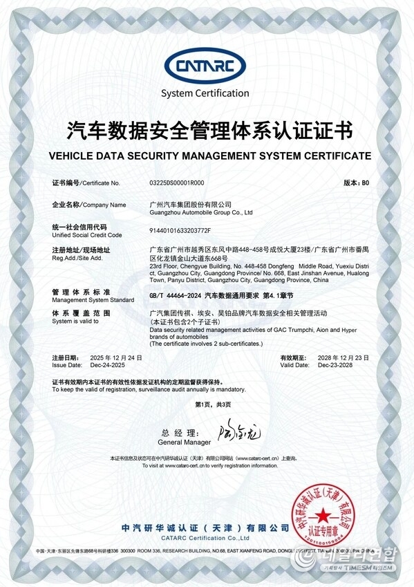 톈진 및 광저우, 중국 2026년 1월 1일 /PRNewswire/ -- GAC가 12월 24일 업계 최초로 차량 데이터 보안 관리 시스템 인증(Vehicle Data Security Management System Certification, 인증서 번호: 03225DS00001)을 획득하며 차량 데이터 보안 분야에서 공식적으로 다시 한번 인정받았다. 이번 성과는 GAC가 업계에서 체계적인 데이터 보안 구축을 선도하고 있음을 보여주는 것으로, 지능형 커넥티드 시대의 자동차 데이터 거버넌스에 대한 새로운 기준을 제시한다.