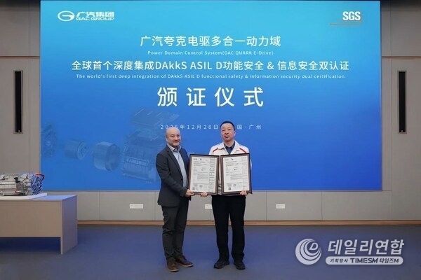 광저우, 중국 2026년 1월 11일 /PRNewswire/ -- 최근 광저우자동차그룹(GAC)이 독자 개발한 쿼크 전기 구동(Quark E-Drive) 파워트레인 도메인 컨트롤러 시스템이 독일 국가 인증 기구인 DAkkS로부터 세계 최초로 ASIL D 기능 안전 및 정보 보안 심층 통합 부문의 이중 인증을 획득했다. 이번 인증은 세계적인 공인 인증 기관인 SGS-CSTC 표준 기술 서비스(SGS-CSTC Standards Technical Services Co., Ltd.•SGS)의 평가를 거쳐 발행됐다.