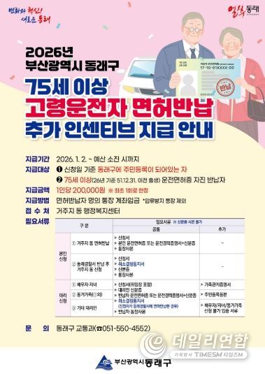 데일리연합 (SNSJTV) 김민제 기자 | 부산 동래구는 고령 운전자 교통사고를 예방하고 안전한 교통 환경을 조성하기 위해 2026년부터 ‘고령 운전자 운전면허 자진 반납 추가 인센티브 지급 사업’을 추진한다고 밝혔다.