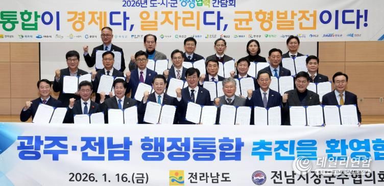 데일리연합 (SNSJTV) 김민제 기자 | 전라남도는 16일 전남도청 왕인실에서 ‘2026년 도-시군 상생협력 간담회’를 열어 지역 대도약을 위한 광주·전남 행정통합 추진에 도와 22개 시군이 공동 보조를 맞추기로 했다.