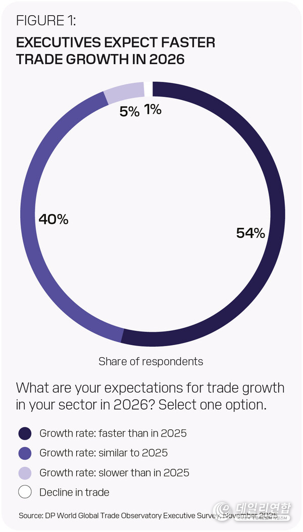 다보스, 스위스, 2026년 1월 21일 /PRNewswire/ -- 글로벌 무역 전망은 취약해 보이지만 비즈니스 신뢰도는 그렇지 않다. 이는 DP 월드(DP World)의 신간 글로벌 무역 관측소(Global Trade Observatory, GTO) 2026 연례 전망 보고서(Annual Outlook Report 2026)의 요점으로, 응답자의 94%가 마찰과 변동성 증가에도 불구하고 2026년도 무역 성장세가 2025년도와 비슷하거나 이를 상회할 것으로 예상했다.