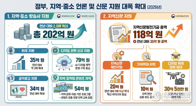 우선 문체부는 언론진흥재단을 통해 지역·중소 방송사 지원 예산을 2025년 35억 원에서 2026년 148억 원으로 대폭 증액했다.