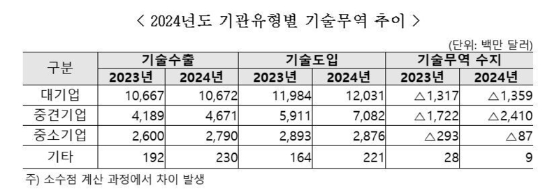 기업 유형별로는 대기업이 227억달러로 전체의 56%를 차지했지만 비중은 전년보다 2.7%포인트 하락했다. 중견기업은 기술 수출이 11.5%, 도입이 19.8% 늘며 기술무역 규모가 16.4% 증가했다. 중소기업은 기술 수출이 7.3% 증가하고 도입은 0.6% 감소해 기술무역수지가 70.4% 개선됐다.