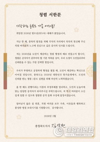데일리연합 (SNSJTV) 김민제 기자 | 김영환 충북도지사가 2026년 병오년(丙午年)을 ‘도민이 체감하는 청렴 행정의 해’로 만들겠다는 의지를 담은 청렴서한문을 전 직원에게 발송하고, 올 한 해 청렴 실천을 당부했다.