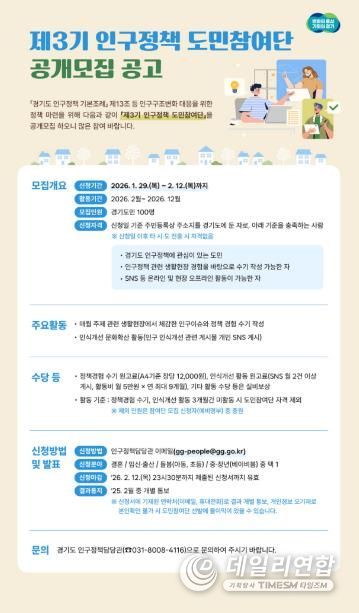 데일리연합 (SNSJTV) 김민제 기자 | 경기도가 정책 대상자가 직접 정책개선에 참여하는 ‘제3기 인구정책 도민참여단’ 100명을 공개 모집한다.