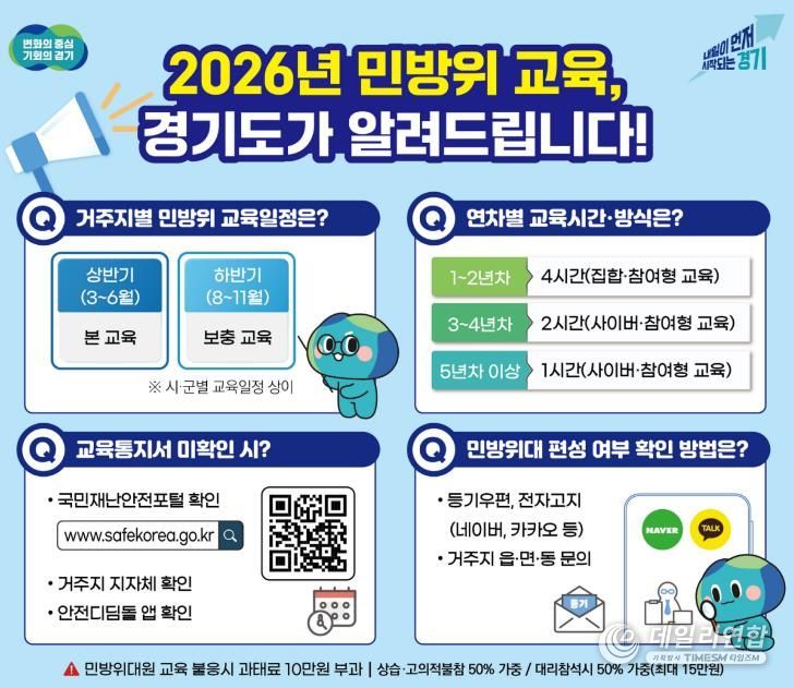 데일리연합 (SNSJTV) 김민제 기자 | 경기도가 ‘2026년도 민방위 교육’과 관련해 도민들의 편의를 위해 시군별 문의가 많은 사항을 중심으로 교육대상·교육시간·교육방법을 안내했다.
