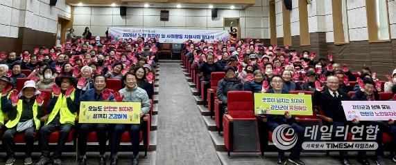 사회자의 구호에 맞춰 “머리안전-모자착용”, “손보호-장갑착용”, “몸안전-조끼착용”을 함께 외치고, 강진원 군수가 노인일자리 대표에게 모자·코팅장갑·형광조끼를 착용시키는 방식으로 진행된 퍼포먼스는 참여자들이 안전수칙을 쉽고 명확하게 체득하도록 했다.