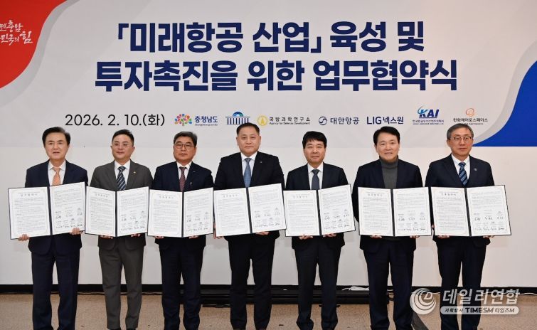 김태흠 지사는 10일 태안문화예술회관에서 성일종 국회의원, 이정석 국방과학연구소 부소장, 대한항공·LIG넥스원·한국항공우주산업(KAI)·한화에어로스페이스 등 4개 참여 기업 관계자가 참석한 가운데 미래항공 산업 육성 및 투자 촉진을 위한 업무협약을 체결했다