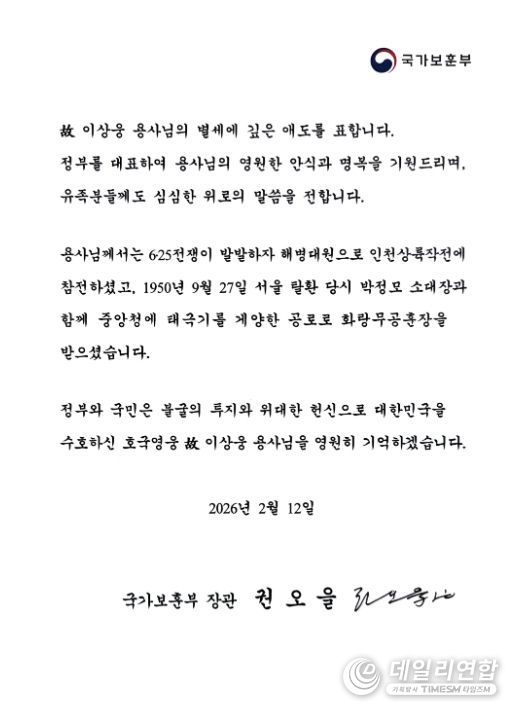 데일리연합 (SNSJTV) 김준 기자 | 6‧25전쟁이 한창이던 1950년 9월, 아군의 서울수복 당시 박정모 소대장과 함께 중앙청에 태극기를 게양했던 이상웅 참전용사가 별세함에 따라 권오을 국가보훈부 장관이 13일 조전을 보내 “호국영웅을 영원히 기억하겠다”며 고인의 명복을 빌었다.