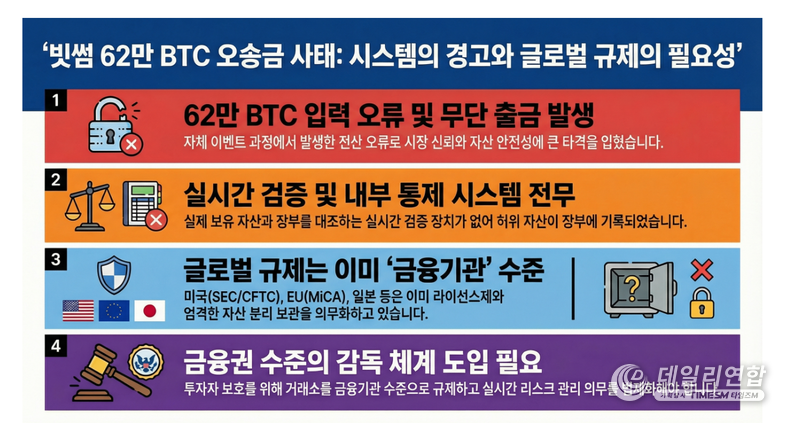 데일리연합 (SNSJTV) 임재현 기자 | 국내 최대 암호자산 거래소 빗썸에서 발생한 비트코인 오송금 사건은 단순 입력 오류를 넘어 거래소 운영체계의 구조적 취약성과 규제 공백을 적나라하게 드러냈다는 평가가 나오고 있다.
