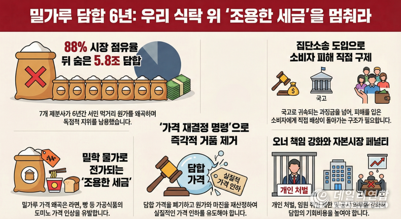 데일리연합 (SNSJTV) 김용두 칼럼 | 서울 마트에서 라면과 식빵 가격이 “유난히” 비싸게 느껴졌던 시간은 단순한 체감이었을 가능성이 커졌다. 공정거래위원회가 2019년 11월부터 2025년 10월까지 약 6년간 국내 B2B 밀가루 시장에서 가격·물량을 합의했다는 혐의로 7개 제분사를 조사·심의 절차에 착수했고, 담합 영향을 받은 관련매출액을 약 5조8000억원으로 산정했다는 보도가 잇따랐다. 최대 과징금은 관련매출액의 20% 수준까지 거론된다.