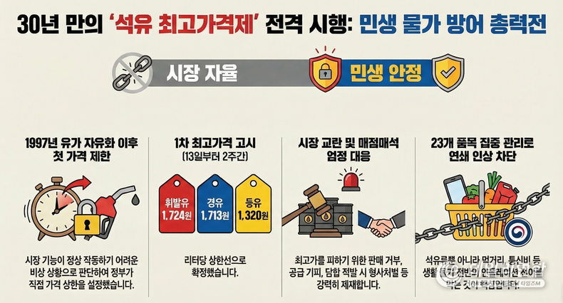 데일리연합 (SNSJTV) 김용두 기자 | 정부가 1997년 유가 자유화 이후 처음으로 석유제품 최고가격제를 한시 도입하면서, 한국 경제가 다시 한 번 ‘비상 물가관리 체제’로 들어갔다. 중동발 전쟁 리스크와 국제유가 급등, 환율 불안이 한꺼번에 밀려드는 상황에서 정부는 더 이상 시장 자율에만 맡겨둘 수 없다고 판단했다.