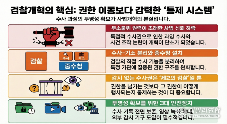 법조계 한 관계자는 “검찰개혁은 반드시 필요하지만, 감시받지 않는 수사권은 어떤 기관이든 동일한 문제를 반복할 수 있다”며 “권한 이동이 아닌 통제 시스템 구축이 개혁의 핵심이 돼야 한다”고 강조했다.