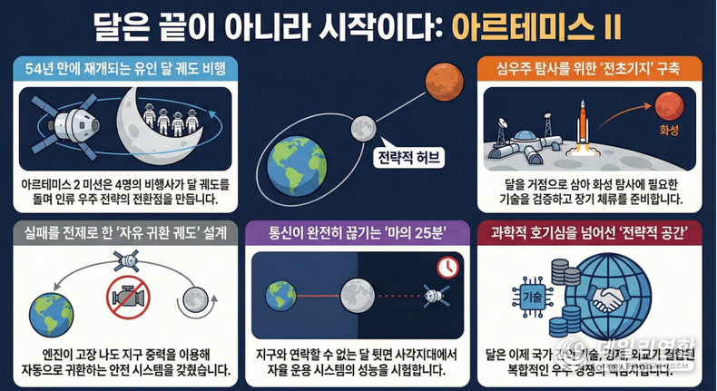이번 아르테미스 미션이 갖는 의미는 단순한 우주 탐사의 재개가 아니다. 인류가 다시 달을 향해 움직이기 시작했다는 점이다. 이는 과거의 재현이 아니라, 새로운 우주 전략의 출발점이다.
