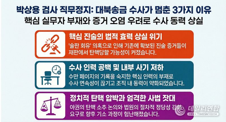 데일리연합 (SNSJTV) 정상규 기자 | 대북송금 의혹 수사의 핵심 실무자였던 박상용 검사에 대해 법무부가 전격적인 직무정지 처분을 내렸다. 이화영 전 경기도 평화부지사에 대한 '술판 회유' 및 진술 조작 의혹이 불거진 가운데, 더 이상 해당 검사가 수사를 지속하는 것이 직무수행의 공정성을 심각하게 위배할 우려가 있다는 판단이 작용한 것으로 풀이된다.