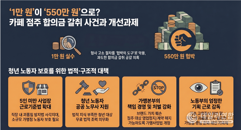 또한, 이번 사건처럼 합의금을 갈취하는 행위를 방지하기 위해 형사 합의 과정에서 법적 조력을 받기 어려운 청년 노동자들을 위한 '공공 노무사 지원 제도'의 법적 의무화가 필요하다. (행정절차법 및 근로감독관 규정 개정안)