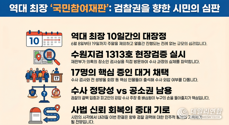 이번 재판은 6월 8일부터 19일까지 주말을 제외하고 열흘 동안 진행된다. 재판부는 국민의 눈높이에서 사건의 실체를 파악하기 위해 재판 둘째 날 저녁, 의혹의 장소인 수원지검 1313호 검사실을 직접 찾는 현장검증을 실시하기로 했다.
