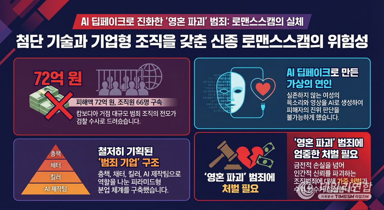 이들은 단순한 사기를 넘어 AI 기술로 가공된 가상의 인물을 앞세워 피해자들의 정서적 신뢰를 이용하는 치밀함을 보였으며, 그 피해액은 72억 원에 달하는 것으로 확인됐다.