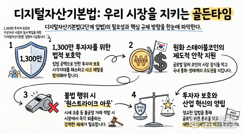 당정과 국회는 신속한 법안 상정을 통해 ‘투자자 보호’와 ‘산업 혁신’이라는 두 마리 토끼를 잡을 수 있는 정교한 입법안을 완성해야 할 것이다. (디지털자산기본법안 제2단계 입법 쟁점 사항 관련)