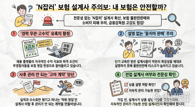 데일리연합 (SNSJTV) 김민제 기자 | 금융감독원이 삼성화재, 메리츠화재(000060) 등 주요 손보사 4곳을 긴급 소집하며 'N잡러(겸업) 보험설계사' 운영 실태에 대한 고강도 점검에 착수했다. 최근 경기 둔화와 맞물려 전문성 없는 무경험자들이 보험 영업 현장으로 대거 유입되면서, 금융상품의 본질인 전문성이 훼손되고 불완전판매 리스크가 임계점에 도달했다는 판단에서다.