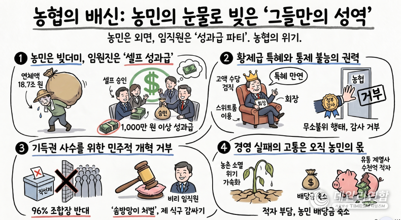 특히 지역 농가들이 고금리와 생산비 폭등으로 도산 위기에 처한 상황에서, 중앙회와 계열사 임직원들이 벌인 ‘성과급 파티’와 ‘특혜성 관행’은 단순한 경영 실책을 넘어 사회적 박탈감을 심화시키는 촉매제가 되고 있다.