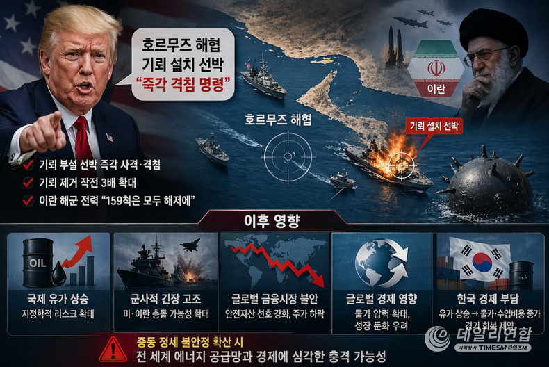 데일리연합 (SNSJTV) 정상규 기자 | 도널드 트럼프 미국 대통령이 호르무즈 해협에서 기뢰를 설치하는 선박에 대해 즉각 격침을 명령하면서 중동 지역의 군사적 긴장이 급격히 고조되고 있다. 이번 조치는 단순한 경고를 넘어 실제 군사 행동을 전제로 한 강경 대응이라는 점에서 국제사회에 상당한 파장을 미치고 있다.