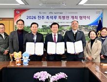 데일리연합 (SNSJTV) 김민제 기자 | “올해 4월 진주에서 개최되는 '2026 진주 촉석루 특별전'의 성공적인 개최를 위해 함께 하겠습니다.” 진주시는 15일 시청 5층 기업인의 방에서 ‘국립진주박물관’, ‘(사)진주목문화사랑방’과 '2026 진주 촉석루 특별전'의 개최를 위한 업무협약(MOU)을 체결했다고 밝혔다. 이날 협약식에는 조규일 진주시장, 장용준 국립진주박물관장, 감상수 (사)진주목문화사랑방 상임이사 등 관계자들이 참석해 특별전 개최를 위한 협력을 약속했다. 이번 특별전은 (사)진주목문화사랑방이 주최하고 촉석루의 가치를 재조명하기 위해 민관 합동으로 추진된다. '2026 진주 촉석루 특별전'은 ‘국립진주박물관’과 ‘진주시립이성자미술관’에서 올해 4월에 개최될 예정이며, 전시 기간에는 영남 제일의 아름다운 누각으로 알려진 ‘촉석루’와 관련된 작품들이 전시된다. 특히 진주성 촉석루의 풍경화만을 그리면서 촉석루 화가로 널리 알려진 ‘故 조영제 화백’의 유화작품을 비롯해 한국 현대미술사에서 수묵채색화의 거장으로 평가받는 ‘故 박생광 화백’의 수묵화 등 50여 점의 주옥같은 작품이 전시될 예정이다. &