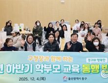 데일리연합 (SNSJTV) 김민제 기자 | 울산 동구는 12월 4일 오후 2시부터 4시까지 동구 청소년 진로지원센터 3층에서 ‘2025년 하반기 학부모 교육 동행(동구와 행복한) 반상회’를 개최했다. ‘학부모 교육 동행 반상회’는 관내 초·중·고등학교 학부모 30여 명이 참석했으며, 학부모 대상 진로 체험과 구청장과의 대화로 나뉘어 진행됐다. 학부모들은 강사의 지도에 따라 ‘플라워 박스 만들기’ 체험을 하며 자녀의 진로 교육을 간접적으로 경험하는 시간을 가졌다. 이어 김종훈 동구청장과 함께하는 ‘구청장과의 대화’가 열려 구청장과 학부모들이 자유로운 분위기 속에서 지역 교육과 생활 전반에 대한 다양한 의견을 나눴다. 김종훈 동구청장은 “아이들의 성장과 행복을 위해 학부모님들의 목소리에 귀 기울일 수 있었던 뜻깊은 시간이었다”라며, “앞으로도 학교와 가정, 지역이 함께하는 교육 공동체를 만들어가겠다”라고 말했다.