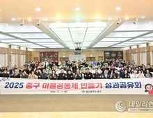 데일리연합 (SNSJTV) 김민제 기자 | 울산 중구가 12월 11일 오후 2시 중구청 대회의실에서 ‘2025년 중구 마을공동체 만들기 사업 성과공유회’를 개최했다. 이번 행사에는 김영길 중구청장과 박경흠 중구의회 의장, 12개 마을공동체 대표 및 회원 등 120여 명이 참석했다. 이날 참석자들은 올 한 해 중구 마을공동체 만들기 사업의 성과를 살펴보고 다양한 활동 경험을 공유했다. 이어서 마을공동체 성안문화공감은 ‘성안 할미가 들려주는 숯못 이야기’, 약사동 우리끼리는 ‘이웃과 함께 만들어가는 써머 페스티벌’이라는 주제로 마을공동체 만들기 사업 우수사례를 발표했다. 한편, 마을공동체 만들기 사업은 주민들이 자발적으로 마을에 필요한 사업을 제안하고 추진하는 주민 주도형 사업으로, 이웃 사이의 소통을 강화하는 ‘이웃 만들기’. 마을 현안을 발굴하고 해결하는 ‘마을 만들기’ 두 가지 유형으로 나뉜다. 올해는 ‘이웃 만들기’ 유형에 7개, ‘마을 만들기’ 유형에 5개 마을공동체가 참여해 △환경 개선 △사회적 돌봄 △주민 화합 등 다양한 주제의 사업을 추진했다. 김영길 중구청장은