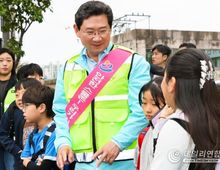 데일리연합 (SNSJTV) 김민제 기자 | 이상일 용인특례시장은 14일 아침 처인구 고림로에 위치한 고진초등학교 정문 횡단보도에서 어린이들의 안전한 통학환경 조성을 위한 교통지도 봉사활동에 참여하고 학교 주변 통학로를 점검했다. 이상일 시장은 서경란 고진초 교장, 녹색어머니회·학부모회·학생 등 60여명과 함께 등굣길 어린이들이 안전하게 길을 건널 수 있도록 돕고 운전자들에게 ‘어린이보호구역 내 서행’을 당부하는 교통안전 캠페인을 펼쳤다. 이 시장은 통학로 현장을 둘러보며 ▲고림고 유리방음벽 모서리 보호대 설치 ▲고림고~힐스테이트용인고진역 구간 횡단보도 너비 확대 ▲해당 구간 도로의 물고임 등 도로시설물 일제정비 ▲통학로 낙엽제거(보행자 미끄러짐 방지) 등의 추가 건의사항을 꼼꼼히 챙겼다. 이상일 시장은 녹색어머니회와 학부모회 회원들에게 “아이들의 등굣길을 지켜주셔서 감사 드린다”며 “학생들이 마음 놓고 통학할 수 있는 안전한 도시 환경을 만드는 것이 무엇보다 중요한 만큼 시에서도 현장을 잘 살펴 필요한 조치를 신속히 진행하겠다”고 말했다. 이 시장은 10월과 11월에도 용인신촌초, 백현초, 구갈초