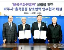 데일리연합 (SNSJTV) 김민제 기자 | 파주시가 율곡 이이 선생의 학문과 철학을 체계적으로 계승하기 위해 추진 중인 ‘율곡문화진흥원’설립을 위해 지난 6일 율곡 선생의 후손인 덕수 이씨 종중과 업무협약을 체결했다. 파주시장 접견실에서 치러진 이날 협약식 현장에는 김경일 파주시장을 비롯한 파주시 관계자들과 덕수 이씨 대종회, 덕수 이씨 찬성공파 종회를 대표하는 인사와 율곡 선생의 종손이 참석해 율곡문화진흥원 설립 추진을 위한 상호 간 협력을 다짐했다. 협약의 주요 내용으로는 율곡문화진흥원 건립부지 확보 상호협조, 율곡문화진흥원 설립 기본계획 및 추진방향에 대한 협력, 율곡이이 선생 관련 종중 보유 역사·문화자료 제공, 사업 추진에 필요한 협력체계 구축 등이다. 김경일 파주시장은 “이번 협약은 율곡 선생의 정신을 현대적으로 계승하고, 파주시를 대표하는 역사·문화 자산을 체계적으로 발전시키는 중요한 출발점”이라고 강조하며 “율곡문화진흥원이 학술과 교육, 문화가 융합된 거점시설로 자리매김할 수 있도록 율곡 종중과의 협력에 최선을 다하겠다”라고 말했다. 율곡 종중 관계자 역시 “율곡 선생의 사상과 업적
