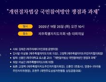 데일리연합 (SNSJTV) 장우혁 기자 | 제주특별자치도의회, 제주특별자치도 주민자치위원회협의회, 제주대학교 리걸클리닉센터, 제주미래디자인포럼, 사회적협동조합 제주로 공동 주최로 11월 25일 오전 10시, 제주특별자치도의회 1층 대회의실에서 '제주도민과 함께 쓰는 개헌절차법 토론회'를 개최한다. 국민주권 시대에 국민이 주도하는 헌법 개정 요구가 커지고 있고 이에 시민의회 방안, 국민청원 방안, 추진협의회 방안 등 국민참여방안을 담은 개헌절차법안이 3건이 국회에 발의됐지만 3건 법안의 국민참여방안은 제주도민의 의견을 충분히 반영하기에는 미흡하다는 지적이 있음에따라 이번 토론회는 제주도민의 목소리가 실질적으로 담길 수 있는 개헌절차법 제정 방안을 깊이 있게 모색하기 위해 마련됐다. 토론회는 이상봉 제주특별자치도의회 의장의 인사말로 시작하여 이남근 제주특별자치도의회 의원이 좌장을 맡고 신용인 제주대학교 로스쿨 교수가 '개헌절차법상 국민참여 방안 쟁점과 과제'를 주제로 발표할 예정이다. 또한 고정학 제주특별자치도주민자치위원회협의회장, 신훈민 변호사, 양광수 아라동 주민자치위원장, 조현주 국민주도상생개헌행동 상임공동